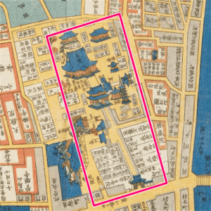 浅草正式名称は金龍山浅草寺という江戸で最古の寺院。上図の赤枠部分は、雷門から本堂に至る場所だ。家康が祈祷所に定めてから現在まで、参詣者の絶えない名所。(国立国会図書館蔵)