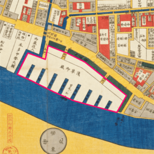 蔵前幕府が全国から徴収した年貢米を納めていた倉庫「御蔵」があったことが、蔵前の地名の由来。隅田川を埋め立てた地にあり、8本の船入れ堀を設置して荷揚げした。川岸にある「首尾の松」という松の木は、吉原帰りの客が松の下で舟を泊め、遊女との首尾(事の始終)を語り合ったことからこう呼ばれた。(国立国会図書館蔵)