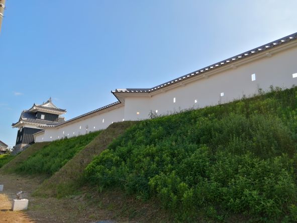 土塁上に折れを設けた西尾城の土塀。絵図に基づいて復元された。