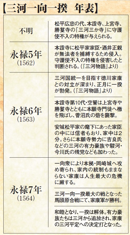 そして戦国時代には、野寺の本證寺(ほんしょうじ/安城市)・佐々木の上宮寺(じょうぐうじ/岡崎市)・針崎の勝鬘寺(しょうまんじ/岡崎市)といった本願寺派寺院が「三河三か寺」と称されて勢威を誇り、それぞれ100か寺以上の末寺を抱える一大勢力となっていた。一揆の原因は、『三河物語(みかわものがたり)』によれば、家康の家臣・酒井正親(さかいまさちか)が、謀反人の追捕を理由として本證寺に入ったことで、守護使不入(しゅごしふにゅう)の特権を侵害されたことにあるとされるが、はっきりしたことはわかっていない。