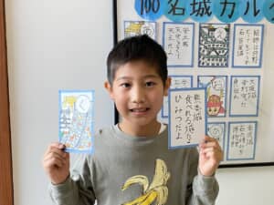 小学校2年生では夏休みの自由研究でオリジナル「日本100名城カルタ」を作成。同じ年の冬に、松江歴史館(松江市殿町)に展示をしてもらいました。