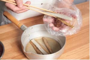 ❶ ゴボウは鍋に入る大きさ、太ければ縦半分に切る。鍋に入れて水を注ぎ、煮立ったら弱火で10分茹でる。