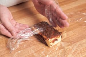 ❸ ラップを広げて、Aの1/3量とゴーダチーズを包み、一晩漬ける。