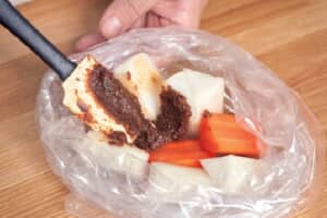 ❹ 袋に汁気を切ったゴボウを入れ、別の袋に汁気を絞った大根とにんじんを入れる。それぞれに残ったAの半量を入れて揉み、チーズと同様、一晩漬ける。