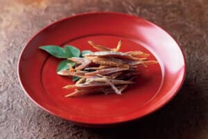 お好みの量の鮭とばを、手や包丁で一口大の大きさに裂き、南天などの飾り葉を添えて盛り付ける。