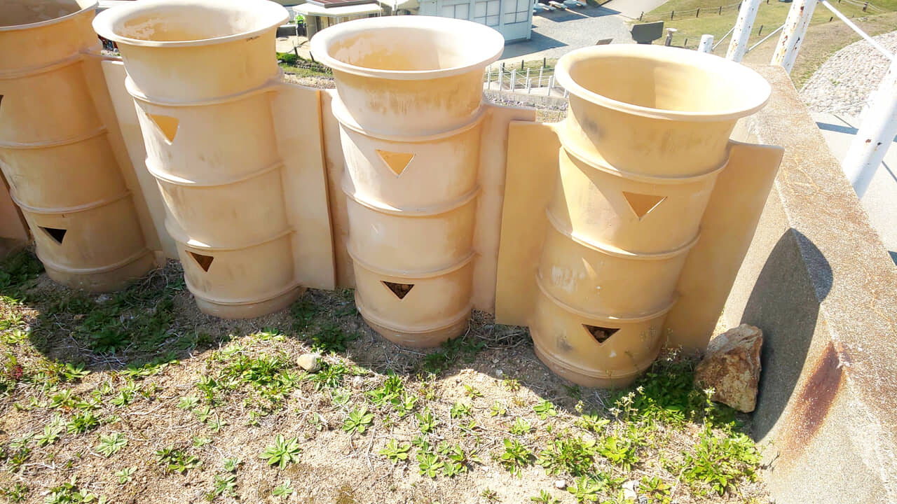 五色塚古墳の円筒埴輪再現展示。古い時代の円筒埴輪はヒレがついていて、隙間をつくらないようにして古墳を守っていたと考えられる。