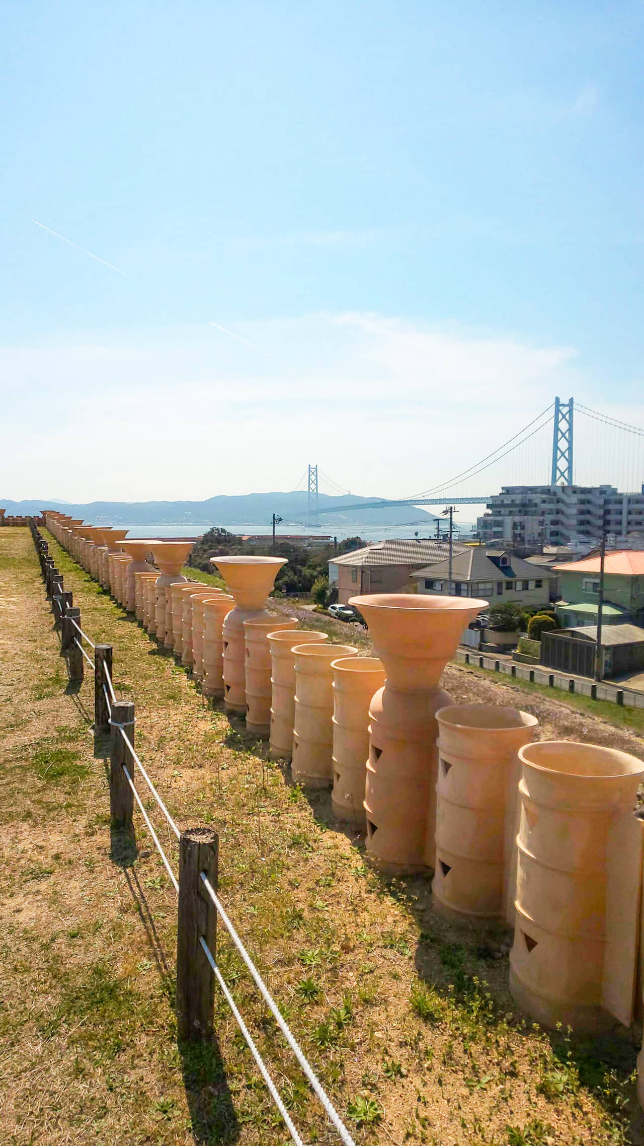 五色塚古墳の円筒埴輪列。大量生産された埴輪がずらりと並ぶ光景は、現代においても壮観だ。