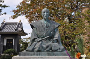 三成が生まれた屋敷の跡地であり、ゆかりの鎧や古文書などが展示されている石田会館(滋賀県長浜市石田町治部)に立つ石田三成像。