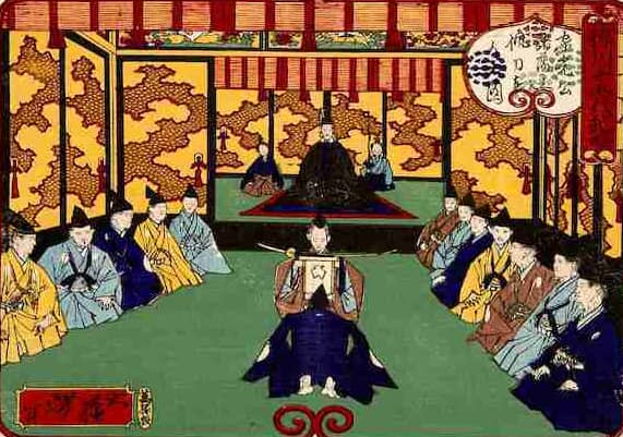 徳川十五代記略・家光公諸藩主江佩刀を給ふ図(東京都立図書館)