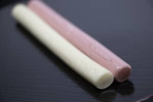 千歳飴の特徴は、その長さ、形、色。一般的な千歳飴は細長くて紅白の2色です。普通の飴と違ってとても長いので、なぜこのような形をしているのか不思議ですよね。