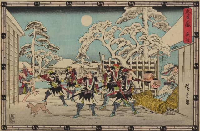 元禄15年(1702)12月14日の赤穂藩浪人による吉良邸討入りは、浮世絵にも数多く描かれる。歌舞伎の演目としても、人気の題材であった。