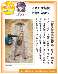 朝日小学生新聞で2月8日、小学1~3年生向けの「ほっとニュース」というコーナーで、奈良市の富雄丸山古墳(とみおまるやまこふん)で見つかった「木棺(もっかん)」が公開された話題を紹介しました。低学年の方に興味を持ってもらえるか心配ではありました。しかし長い間、木の箱が腐(くさ)ることなくきれいに残っていたことに、驚(おど)いてもらえるはずと思いました。