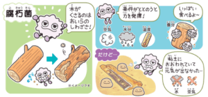 木が腐るのは、微生物(びせいぶつ)「腐朽菌(ふきゅうきん)」の働きによるものです。そして腐朽菌が活動するためには、「空気」「水分」「温度」が必要です。富雄丸山古墳の木棺は粘土でおおわれていたため、空気や水の出入りが少なく、腐朽菌が活動できなかったようなのです。また、抗菌(こうきん)作用のある銅(どう)でできた品物が近くに埋(う)まっていたことが影響(えいきょう)した可能性もあるんだとか。