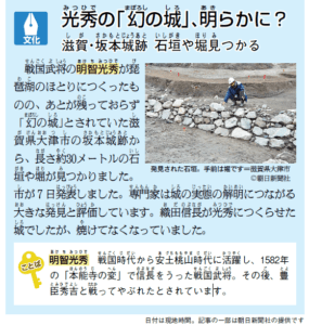 「どうしてだろう」といえば、日本の歴史で大きななぞのひとつが、明智光秀はなぜ信長を討ったのか、ですね。光秀の話題を朝日小学生新聞で2月9日にとりあげました。信長に命じられ、琵琶湖(びわこ)のほとりにつくったとされる「坂本城」。あとが残っておらず「幻の城」とされています。その坂本城跡(滋賀県大津市)から、長さ約30メートルの石垣や堀が見つかったそうです。この発見で、城の実態がわかる可能性があるそうです。続報が、期待されますね。