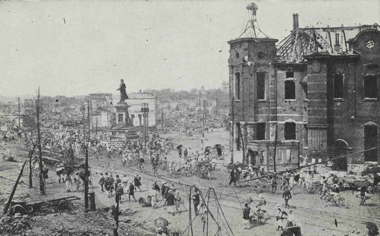関東大震災後に撮影された、万世橋付近の様子。首都東京が壊滅的被害を受け、戦後の不況に輪をかけて経済危機が引き起こされた。