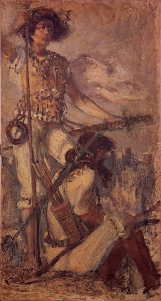 明治時代に勃興したロマン主義を代表する洋画家・青木繁による油彩で明治39年(1906)のもの。青木は『古事記』を愛読しており、古代神話をモチーフにした作品を多く手掛けた。(東京国立博物館蔵/出典:Colbase)