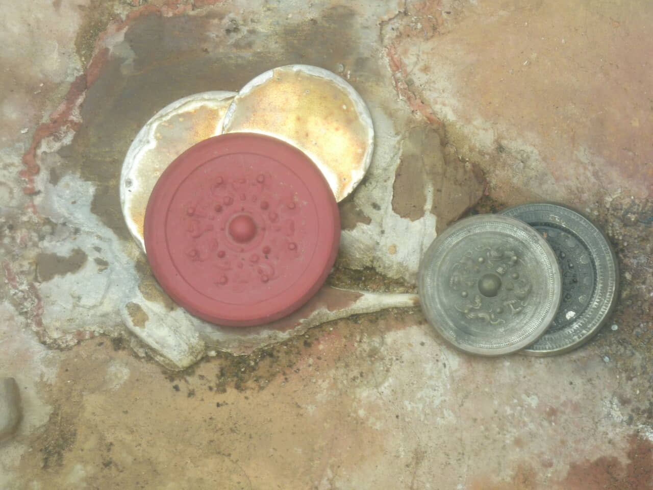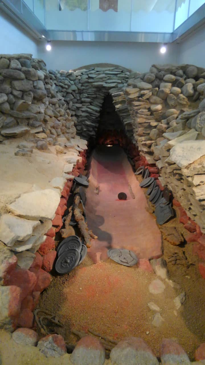 高槻市安満宮山古墳再現展示。舶載鏡5面は権威を示す鏡として丁寧に埋納されていた