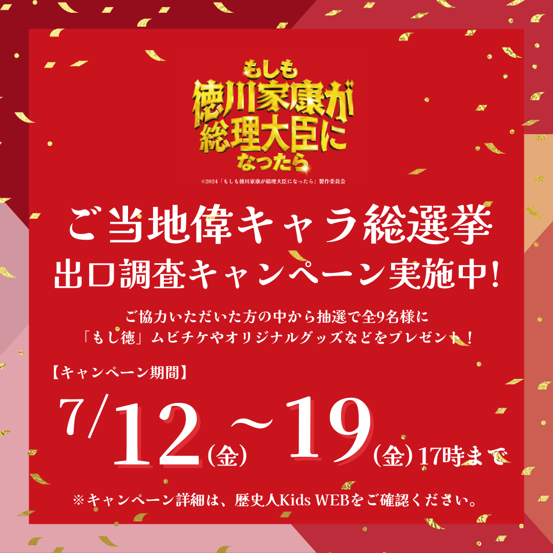 歴史人Kids公式Instagramでは、7/12~19まで総選挙に投票&出口調査にご協力いただいた方の中から、抽選で全9名様に映画『もし徳』ムビチケまたは映画『もし徳』オリジナルTシャツ(非売品)プレゼントキャンペーンを実施します。