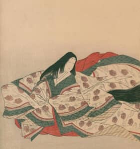 『女房三十六歌仙』に描かれた赤染衛門(国立国会図書館像)。溺愛した息子の挙周については、近年の研究では衛門の実子ではないとする説も浮上している。また、平安後期の歴史物語である『栄花物語』の作者という説もある。