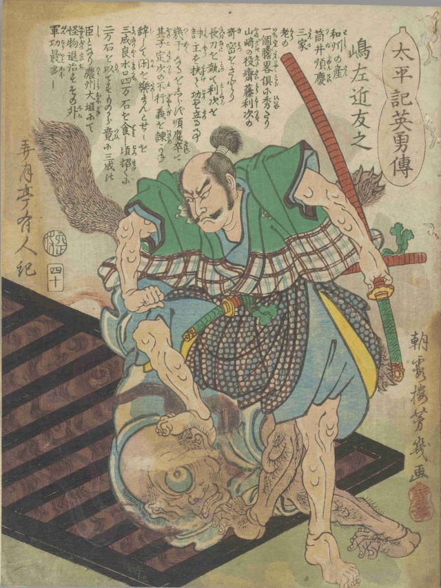 慶長5年(1600)9月15日、左近はこの日、兜には朱色の天衝き、溜塗(ためぬ)りの桶革胴(おけがわどう)の鎧に浅黄色の木綿羽織。黒塗りの長柄槍を右手に持ち、すっくと立ったまま下知する姿は、遠目にも「鬼神」のように映った。押しては引く、引いては押す激戦の最中、疲弊した東軍・黒田隊の全面に出た左近は騎馬で先頭に立った。黒田長政(くろだながまさ)は、選りすぐった歴戦の勇者を島隊にぶつけた。左近は、馬上からの槍で5人までを討ち取り、縦横無尽に走り回ってから、三成の本陣・笹尾山の柵内に戻った。「島左近勝猛、ここにあり」石田本陣から一斉に合唱が湧く。