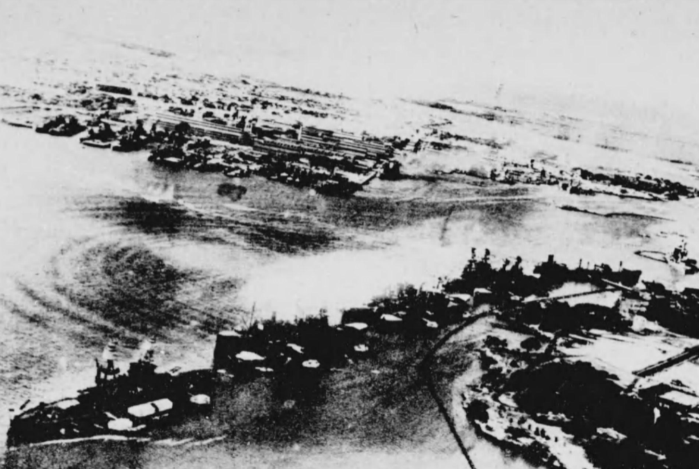 真珠湾で日本軍の攻撃を受けて沈むアメリカの戦艦。