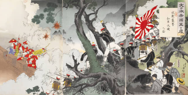 さらに10月24日に日本軍は鴨緑江(おうりょくこう)を渡河して、清国内に進撃。さらに第2軍による遼東半島上陸作戦も行われ、明治27年内に旅順をはじめとする清国の拠点は、次々と日本軍に攻略された。明治28年(1895)になっても日本軍の優勢は変わらず、3月20日になると下関において講和会議が始まる。そして4月17日に「日清講和条約(下関条約)」が結ばれ、日本の完全勝利で戦争は終結した。