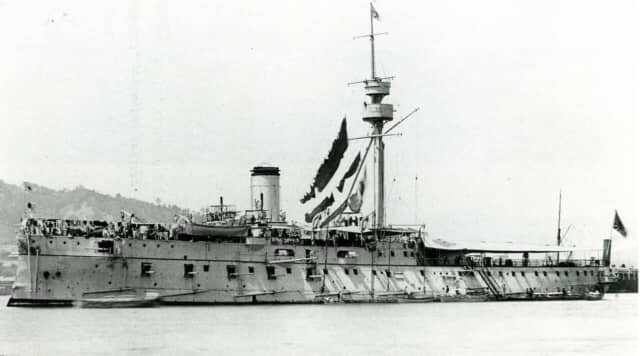 黄海海戦における連合艦隊の旗艦となった防護巡洋艦「松島」。清国海軍が誇る新鋭戦艦「定遠」や「鎮遠」に対抗するために建造された。口径の大きな32cm単装砲(カネー砲)を装備していたのが特徴であった。