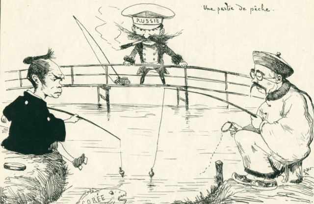 フランスの挿絵画家ジョルジュ・ビゴーが描いた風刺画。日本と清国(中国)が釣り上げようとしている魚(朝鮮)を、橋の上から眺めているロシアが横取りしようとしている絵。「漁夫の利」と解説されることもあった。