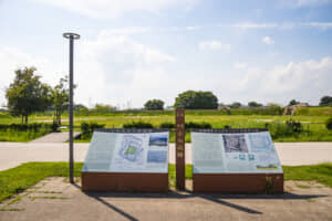 国の指定史跡として残る小田城跡(茨城県つくば市小田)。約21万平方メートルという広大な田畑の中に様々な史跡が残り、案内所も設置されている。