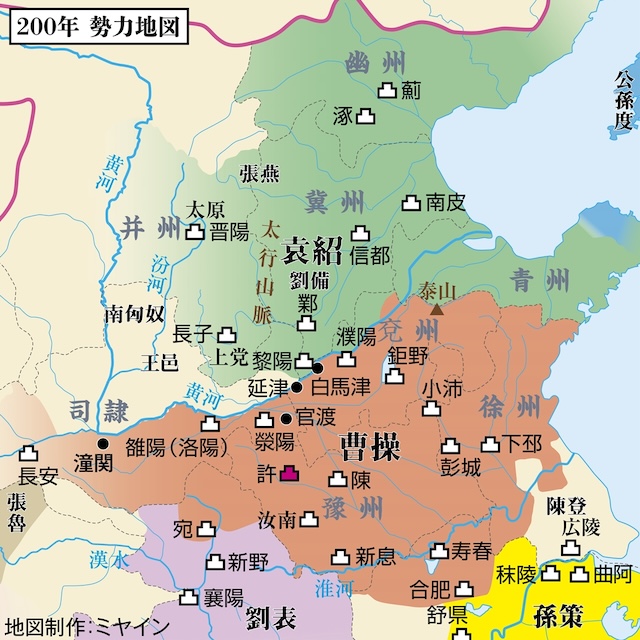 西暦200年、官渡決戦の舞台を中心とした勢力図。作成:ミヤイン 参考『中国歴史地図集 第二冊 秦・西漢・東漢時期』他