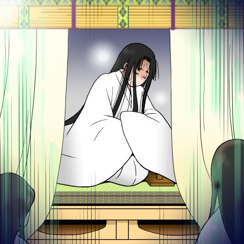 彰子の出産は難産となりました。この時代出産で命を落とす母体は多く、周囲の人々は気が気でなかったはずです。9月10日にはお産の場として、寝殿の中央の母屋に白木(白は邪気を払うとされ、当時お産の場は白一色にされました)の御帳台が準備されましたが、出産の兆候はなく、11日の暁には、御障子を二間分取り外して、母屋から北側の狭い北廂に移りました。御簾などをかけることができず、几帳を幾重にも重ねて、中宮のお姿を隠したのです。難産ゆえに、占いを行ったところ、そのような卦が出たための緊急避難的な処置でした。