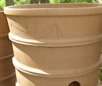 高槻市今城塚古墳で展示されている、再現円筒埴輪。船が帆と錨を下ろして停泊している様子を描いた線刻画が刻まれている。
