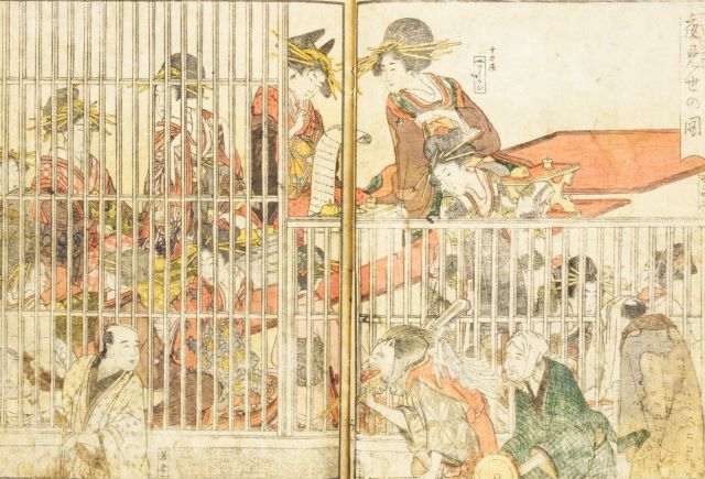各町沿いには、格子の奥にいる遊女を品定めする座敷があった。これが「張見世」である。客はそこに並ぶ遊女から指名することができた。『吉原青楼年中行事』国立国会図書館蔵