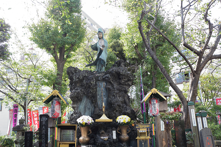 境内に入ると当時の弁天池の惨状の写真や新聞記事などが掲示されている。池は昭和34年に埋め立てられ、境内に、犠牲者を弔う観音像とともに小さく名残を留めている。法要は毎年執り行われ、2023年、100年目の法要に合わせて弁天池の改修工事を進め、新たな吉原の名物にしようと滝を設置。今後は暗いイメージを払拭し、江戸時代のような華やかさを発信していきたいと尽力している。悲しい過去があっても、それを忘れず未来へと進む、吉原という町の逞しさを感じながら、遠い目をメイクさせていただいた。吉原散策の際には必ず立ち寄っていただきたい。