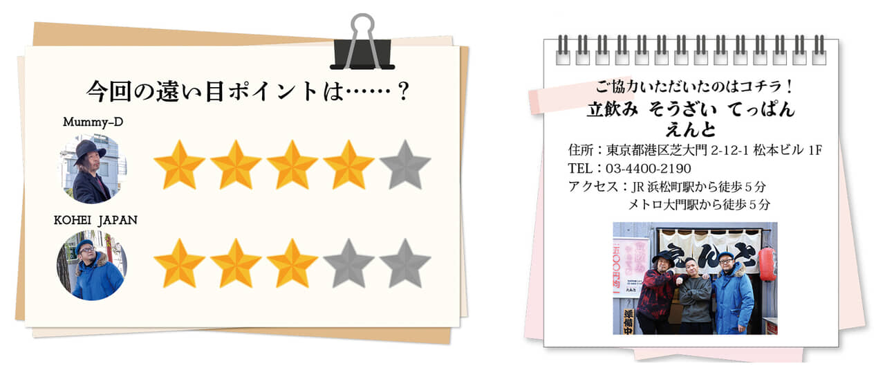 D:ここは俺らの後輩というかね、CUEZERO(キューゼロ)君がやっている立ち飲み屋さんです。「立飲み そうざい てっぱん えんと」さんですね。