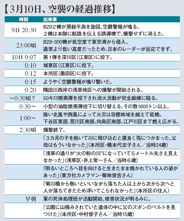1945年3月10日未明、300機のB29が東京を襲った大空襲は、わずか2時間半弱で約9万5000人の市民の命を奪った未曾有の無差別攻撃だった。下町一帯が一夜にして焦土と化したこの夜、どのような地獄絵図が展開されたか。