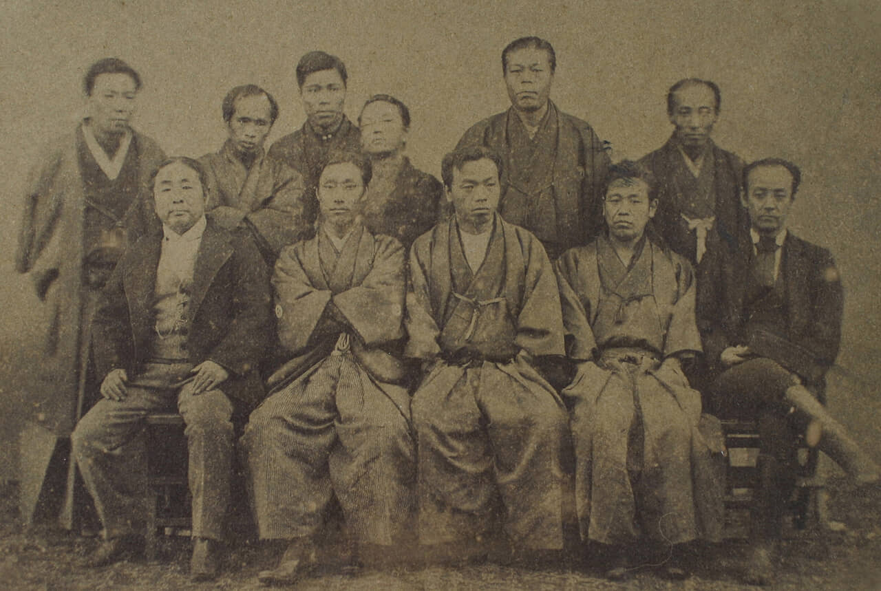 前列右から3人目が江藤新平・司法省高官とともに(佐賀県立佐賀城本丸歴史館蔵)