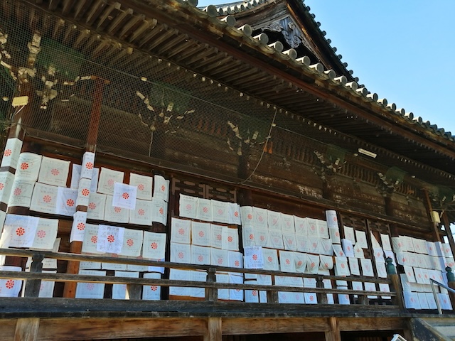 合格祈願の白いハンカチで覆われた家原寺の本堂。ほかではなかなか見られない風景だ。撮影:本渡 章