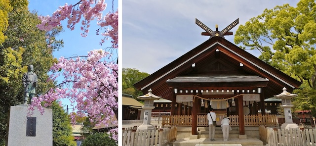 大鳥大社のヤマトタケル像。境内の樹林を背に草薙の剣を携えて立つ。訪れた日は桜が満開だった。大鳥大社の本殿は独特の大鳥造。出雲大社の大社造に次ぐ古形式とされる。撮影:本渡 章