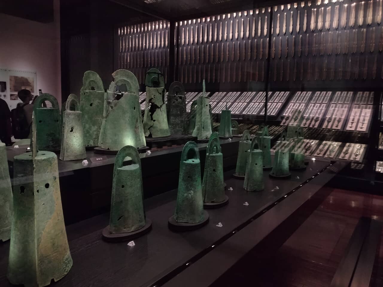 島根県立出雲考古博物館展示の加茂岩倉銅鐸 と荒神谷銅剣。1世紀~2世紀に埋納されたと考えられているので、社会構造の変化を示すと考えられる。