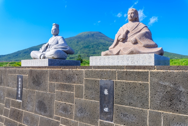 八丈島に立つ宇喜多秀家と豪姫の夫妻像