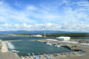 現在の能代港(秋田県能代市浜通町)。1598年(天正17年)に秋田地方を統一した秋田実季は、能代湊(港)を整備。畿内には杉板、丈木、筒木、米、大豆などが運ばれ、畿内からは非自給的な商品が運ばれ、領国経済を活発化していた。