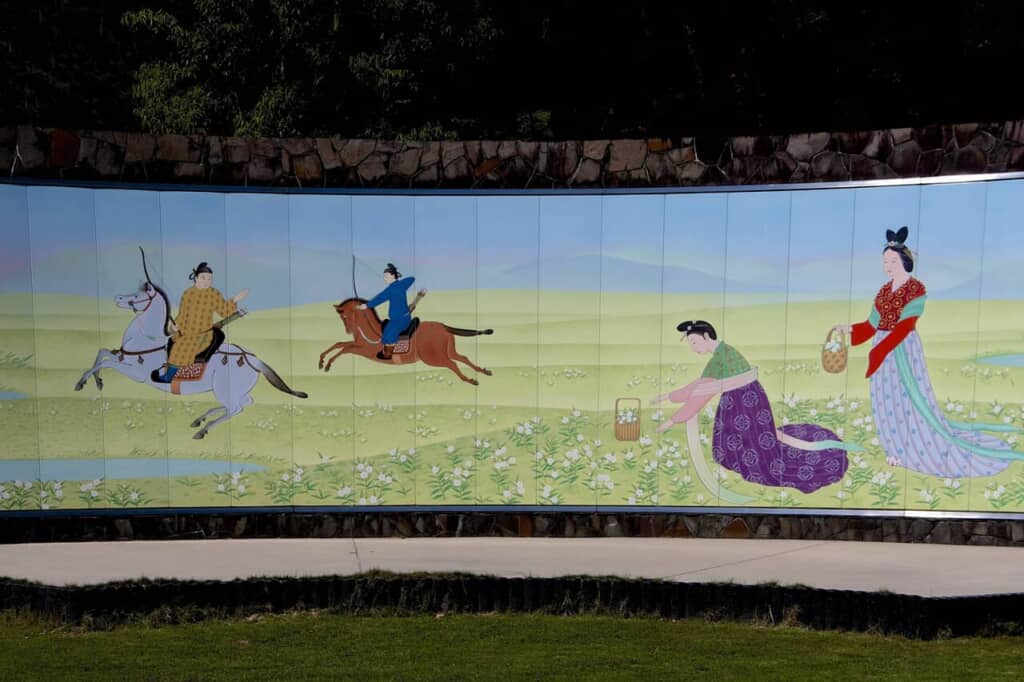 その情景を描いた壁画が、園内に展示されているので見ておこう。幅12m、高さ3mという巨大なレリーフで、馬に乗って狩をする男二人と、薬草を摘む女が描かれている。男とは、いうまでもなく天智天皇と大海人皇子、二人の女の一人が額田王である。そこに描かれているのは実に牧歌的な光景であるが、その実態はどうか?政治的にも私生活においても、実のところ、かなり緊張感を伴ったものであったことは想像に難くない。そんな思惑をもってあらためて見直してみれば、かえって痛々しく見えてしまうから不思議である。