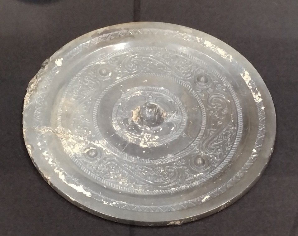 展示公開された虺龍文鏡(きりゅうもんきょう)の実物。まだ保存処理をされる前の状態で、長年磨かれたからであろうヌメヌメ感がよく出ている。