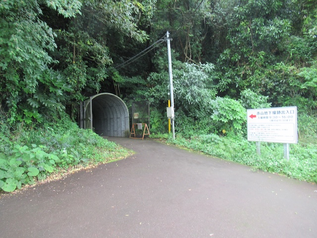 赤山地下壕は館山市立博物館から車で5分程の位置にあり、駐車場も完備している。入口で手続きと入場料を払うと、ヘルメットと懐中電灯を貸し出してくれる。小さな子供用のヘルメットもあり、壕内散策には便利である。地下壕は全長約1.6キロあるが見学路はその内の600m位。かなり暗いところもあり、懐中電灯は必須である。壕内は外気より4~6度低いため、夏季でもかなり涼しく感じる。手掘りの痕跡と凝灰岩質岩肌の色彩が独特なコントラストを示している施設となっている。