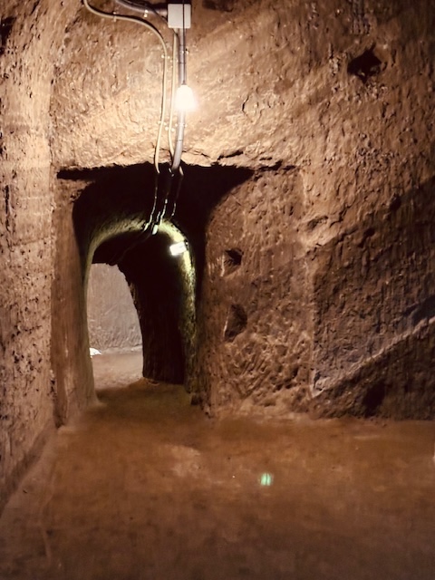 太平洋戦争がはじまり、昭和17年(1942)頃から館山では空襲に備えて防空壕の建設がはじまり、房総半島の地質は凝灰岩質砂岩、同泥岩で構成されており掘削が容易なことから、大規模な広い地下壕建設が進められていった。