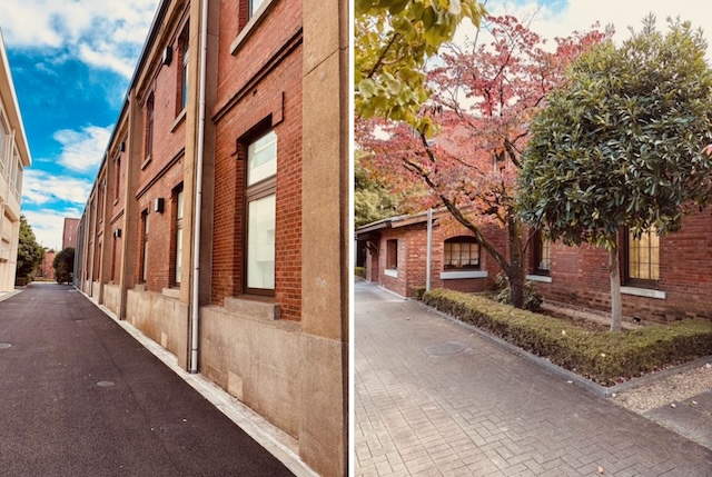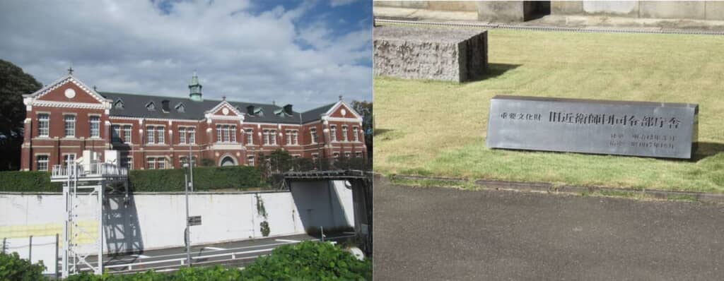 学習院女子大学に残る近衛騎兵聯隊兵舎(左)、学習院中高等部に残る近衛騎兵聯隊兵舎(右)