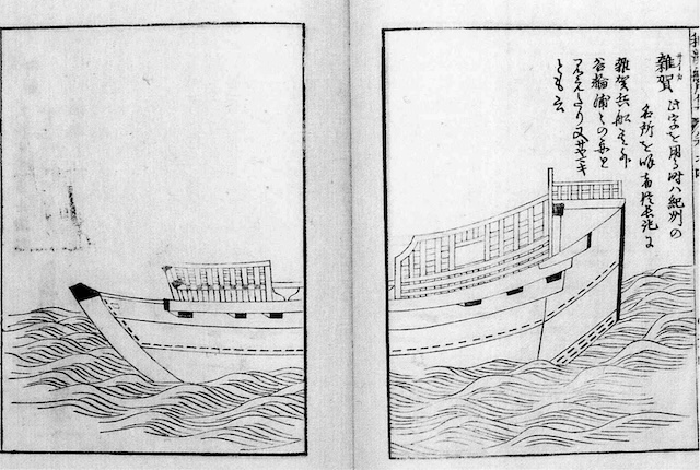 多くの人が思い浮かべる和船のスタイル。これは港から港へと人や荷物を運んだ廻船と呼ばれた船で、江戸時代には菱垣廻船や樽廻船、北前船(西廻り航路)など、輸送網が確立した。図はそこで使われていた代表的な船。