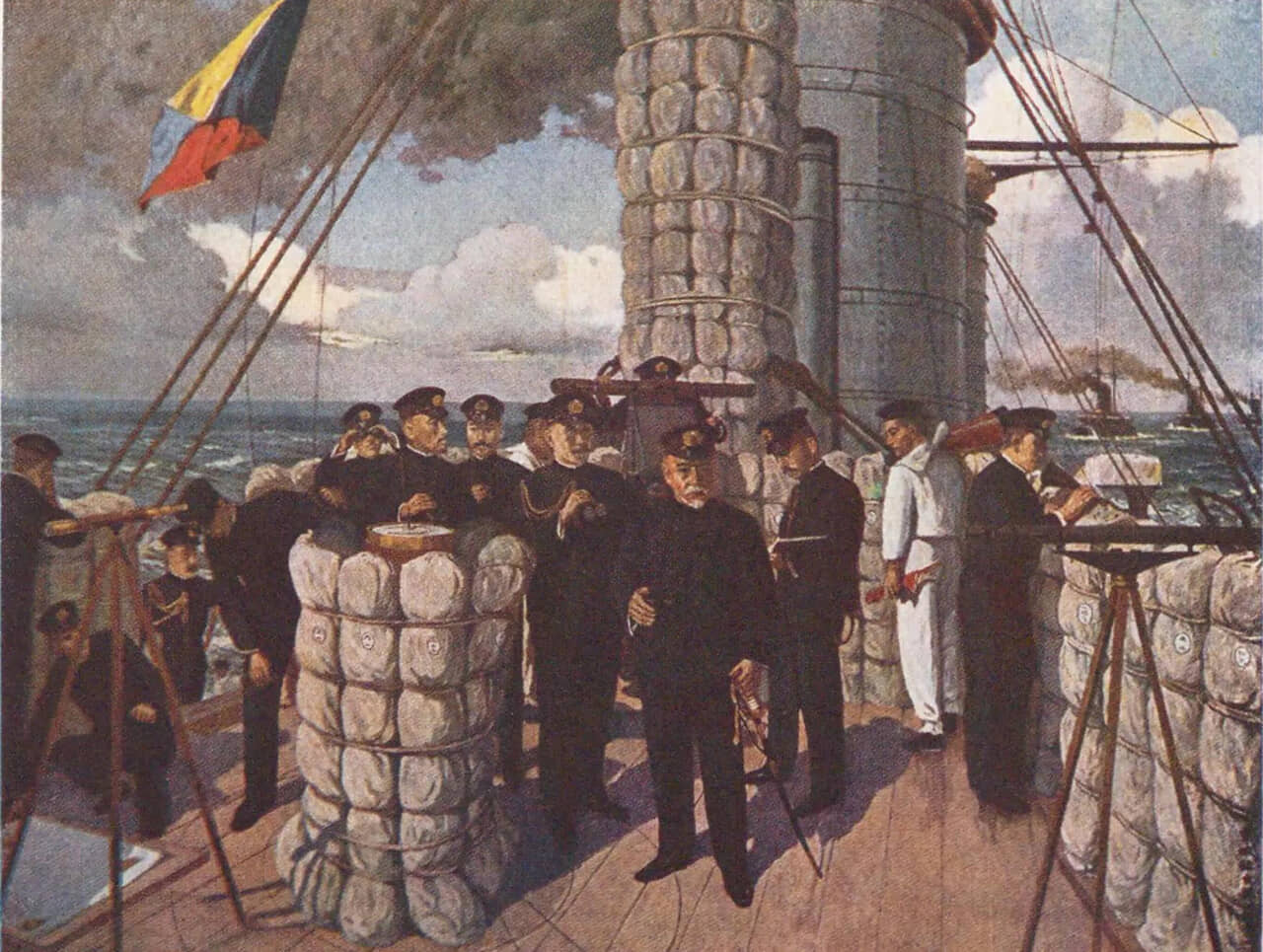 『三笠』艦橋の光景。中央にいるのが東郷平八郎、その右に立つのが秋山信之。