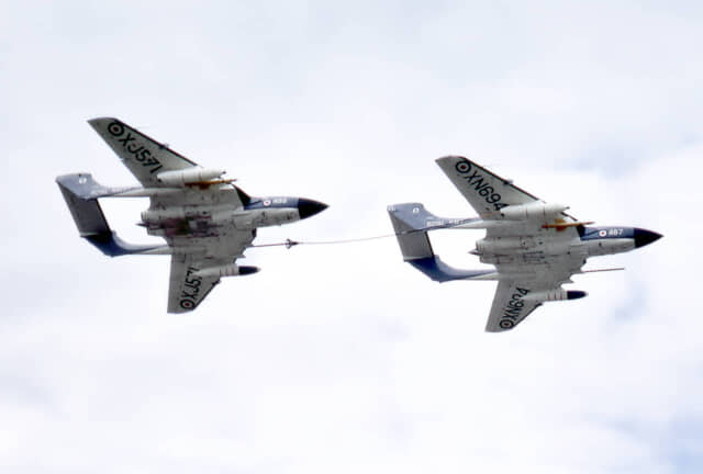空中給油ユニットを懸吊し、バディ・システムで僚機に空中給油を行っているシーヴィクセン。独特の機体形状がよくわかる。